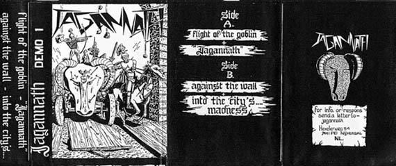 Holland has never been the biggest thrash country in the eighties. Luckily, there are some true quality bands in this genre. JAGANNATH is one of them. They formed in 1985 in Nijverdal (a town in the east). The band was influenced by bands like NASTY SAVAGE, HALLOW'S EVE, but also names like TROUBLE. They released their first demo in 1988, which was a four tracker. Opener "Flight Of The Goblin" is somehow a classic; maybe because of the incredible heavy guitar sound. In between the lot of thrash bandS, which had a thin guitar sound, JAGANNATH really excelled in creating a thick wall of guitars. Just like HALLOW'S EVE, JAGANNATH had a little horror-like atmosphere on the demo, maybe because of the pretty creepy vocals. One year later JAGANNATH released its second demo, called "Crionic Substance". This band progressed a lot in this year, 'cause with this demo they turned out into a much more technical band. Still awesome thrash, with some slower (TROUBLE-like) parts, too. These guys could really play, while vocalist Egbert delivers some creepy vocals again. Even though the quality of both demos was pretty high, the band never released a full-lenght album. After years of silence, JAGANNATH did a reunion gig at the Raise Your Fist festival in 2005. Even though it was still early, when they played their set, the songs certainly survived the test of time. Later that year, the band also did a gig in France. Since then, it became pretty silent around JAGANNATH again...