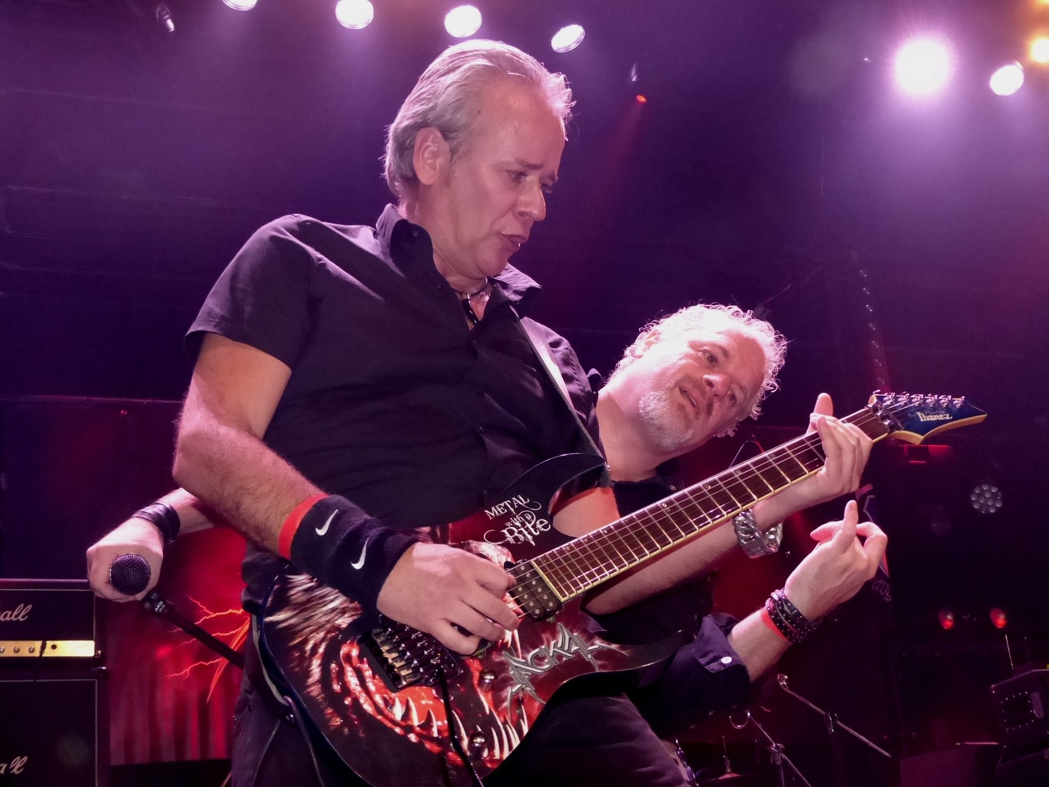Hierna was het de beurt aan Neerlands trots JACKAL, waarvan ik eigenlijk stiekem hoopte dat ze hun nieuwe CD al klaar zouden hebben. Dat was iets te vroeg nog, maar hij staat nu op de planning voor begin 2017, zo heb ik begrepen. Maar voordat dit spektakelstuk los mag gaan, heb ik nog een kort gesprekje met ex SAD IRON zanger en frontman van FINAL HEIRESS Jan Palenstijn. Het was alweer een hele tijd geleden, dat we elkaar gezien hadden. Ik was blij, dat we even tijd hadden om wat bij te kletsen. Het verhaal van JACKAL volgt in grote lijnen het verhaal van TROYEN. Opgericht in 1984, toen wel de nodige jaren bij elkaar geweest, een tijdje stilgelegen en in 2007 weer bij elkaar gekomen om lekker ouderwets met elkaar te knallen. Als de eerste tonen van “Hell Bent For Leather” de zaal ingeblazen worden, ben ik al helemaal van de wereld. Wat blijft dat toch een heerlijk nummer en als je hem hoort in zo’n supervette uitvoering, dan ben je gelijk helemaal bij de les. Even lekker de nekspieren losgooien, maar ook weer niet te heftig, want dan maak je de rest van het optreden niet meer mee. Er worden al wel wat nieuwe nummers gespeeld vanavond, maar het gros bestaat natuurlijk uit nummers van die geweldige “Cry Of The Jackal” CD. Met “Into The Night” duikt de band meteen een heel eind het verleden in. Dit was het titelnummer van de demo uit 1988 en dat is bijna alweer dertig jaar geleden. “Bring It On” en “Anubis” zijn hierna aan de beurt. John Bouman zet zijn beste beentje weer voor en Erwin is vanavond ontzettend goed bij stem. Hij kwijt zich niet alleen van zijn vocale taken, maar toont zich ook een begenadigd frontman, die zoals altijd de zaak aardig op gang kan brengen. De nieuwe nummers, die vanavond de revue passeren, beloven heel erg veel voor de nieuwe release “God Of War”. Hoort zegt het voort! “Necromancer” is weer uit de oude doos en met “The Law” komen we aan bij een persoonlijke favoriet. Het is nog steeds geen ballad. Eventjes heeft het er de schijn van voor een paar seconden, maar als John de volumeknop open draait en begint te scheuren, dan zit Amstelveen bijna een paar tellen zonder licht en water. Zo gaat het tekeer. Zoveel muzikaal geweld op een podium in Nederland, laat Amnesty International het maar niet horen, want je hebt geheid problemen. De LED ZEPPELIN cover “Immigrant Song” gaat er altijd in. Het is een punt van herkenning voor hen, die niet bekend zijn met de nummers van JACKAL. Maar er zijn ook nog genoeg hardere rockers, die zich hier weer helemaal jong bij gaan voelen. Lekker toch zo’n stevige Zep-song tussendoor? Even lekker uit je bol gaan, om vanaf morgen vier dagen met overal spierpijn rond te lopen, maar dat heb ik er wel voor over. Met “Lost And Found” grijpt de gretige band weer terug naar de CD. De ritme sectie mag zeker niet onvermeld blijven bij JACKAL, want met Budnyy Vladik en Rick Waalewijn heeft de band een ritme sectie, waar ze op kunnen vertrouwen. Iets wat misschien wel het belangrijkste is tijdens een optreden. Een misstap van de heren en de zaak loopt in de soep. “Fear” volgt en met “Pain In The Ass” komt er weer een oude vertrouwde kraker voorbij. De solo’s van John zijn feller dan ooit. Al hoor ik in de zaal ook geluiden, dat het gitaargeluid te dun was. Zeker het gehoorapparaat niet aangezet. Dat kan gebeuren met rockers op leeftijd. Met “Deranged” gaat de band richting de eindstreep, maar JACKAL zou JACKAL niet zijn als het dak van de P60 niet eventjes opgetild gaat worden, voordat ze vertrekken. Hans Klok had het niet beter kunnen doen. RIOT’s “Loanshark” laat het podium volstromen met maniacs, die nog even willen headbangen naast de bandleden van JACKAL, die het hem weer flikken om me een glimlach van oor tot oor te bezorgen. Wat blijft dit toch een geweldig nummer in een dito uitvoering. Petje af, als ik er een op had. JACKAL vormt samen met TROYEN voor mij het hoogtepunt van de avond.
