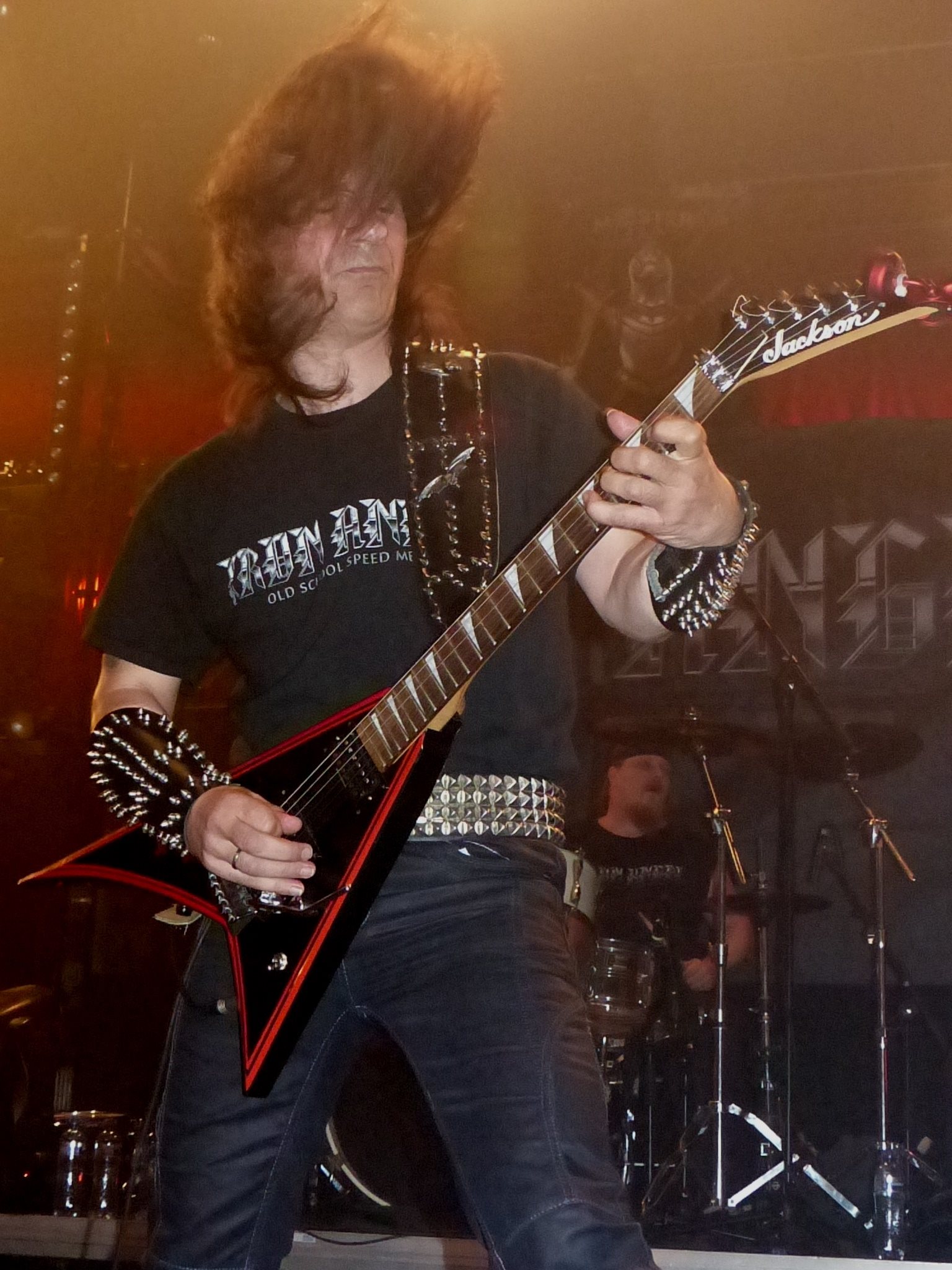 IRON ANGEL is de band, die de avond af mag sluiten hier. De Duitsers spelen speed metal en qua bekendheid zou ik ze in de middenmoot van de Duitse metal scene willen plaatsen. In de jaren tachtig was er een explosie aan metal bands in Duitsland, die zich, qua bekendheid, net onder de enorme rij aan wereldberoemde namen uit dat land bevinden. IRON ANGEL was er een van, samen met o.a. GRAVESTONE, TALON, PARADOX, DARKNESS, ASSASSIN, LIVING DEATH en deze heren die hun carrière startten als METAL GODS. Af en aan bestaat de band en gaan ze weer een tijdje uit elkaar om daarna weer bij elkaar te komen. Speed metal is hun wereld en wat ze doen dat doen ze goed. Opvallend is het feit dat de zoon van Ritchie Blackmore (DEEP PURPLE, RAINBOW, BLACKMORE’S NIGHT) een tijdje deel heeft uitgemaakt van de line-up van IRON ANGEL, maar dat is ook alweer dertig jaar geleden. Dat was toen en nu is nu. IRON ANGEL mag de lichten uitdoen vanavond na een wervelende show, die geopend wordt met het intro “Winds Of War”, wat toevallig ook het titelnummer van het album is waarop J.R. Blackmore meespeelde. De eerste tonen van de band bestaan uit de drieklapper “Metalstorm”, “Sinner 666” en “The Metallian”. Het wordt al snel duidelijk, dat de band gaat voor Deutschen Gründlichkeit. Niets wordt aan het toeval overgelaten. De show staat als een huis en het geluid is hard, maar redelijk zuiver te noemen. “Fight For Your Life”, “Hunter In Chains” en “Legions Of Evil” zijn speed metal nummers, waar je niets over te klagen hebt. Snelle gitaarsolo’s complimenteren de ietwat catchy nummers en stoere poses van deze ijzeren engelen. Veel van de nummers komen van de geweldige “Legions Of Evil” demo, die in 1984 op de mensheid werd losgelaten. De meeste van deze nummers zullen later belanden op hun debuut LP “Hellish Crossfire” uit 1985, dat hun meest succesvolle werkje is, als ik me niet vergis. “Black Mass” en “Heavy Metal Soldiers” volgen en aan het einde van hun show pakt de band nog even terug naar hun tweede LP, die een jaar later uitkwam met “Stronger Than Steel”, afkomstig van “Winds Of War”. Voor mij was het zeker niet de oerknal, die sommigen er misschien van verwacht hadden, maar het was een zeer onderhoudend optreden. Uiteraard laten deze heren zich niet zomaar terugsturen naar de Heimat en geven ze nog een keer vol gas met het ouwetje “Rush Of Power”.