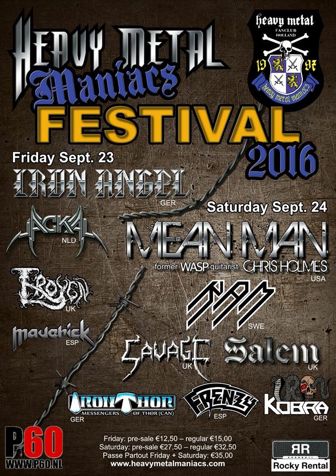 De vakantie gooide deze keer roet in het eten. In feite was het onze bedoeling, dat we twee dagen naar het Heavy Metal Maniacs Festival zouden gaan. Het programma was dermate goed, dat we er ontzettend veel zin in hadden. Maar onze reis richting Denemarken werd tot twee keer toe geannuleerd. Tel hierbij op dat het festival een maand eerder werd gehouden dan voorheen en zo moesten de plannen ineens drastisch gewijzigd worden. Vandaar dat van mijn hand alleen een verslag van de eerste avond komt van dit tweedaagse festival. De dag erna zitten we in de bus richting de Harz in Duitsland. Ook een mooi vooruitzicht, maar volgend jaar maken we hopelijk gewoon weer beide dagen mee. Onderstaand verslag is mijn persoonlijke ervaring van deze prachtige avond. Op het programma staan een mooie doorsnee aan stijlen en bands uit alle windhoeken van Europa. MAVERICK uit Spanje, TROYEN uit Engeland, JACKAL uit ons eigen landje en IRON ANGEL uit Duitsland. Europa is dus goed vertegenwoordigd, maar uiteindelijk spreken we toch allemaal dezelfde taal, want muziek blijft een universele taal, die iedereen verstaat en begrijpt. We staan toch ook met zijn allen vooraan met onze vuisten in de lucht, waar we ook vandaan komen?