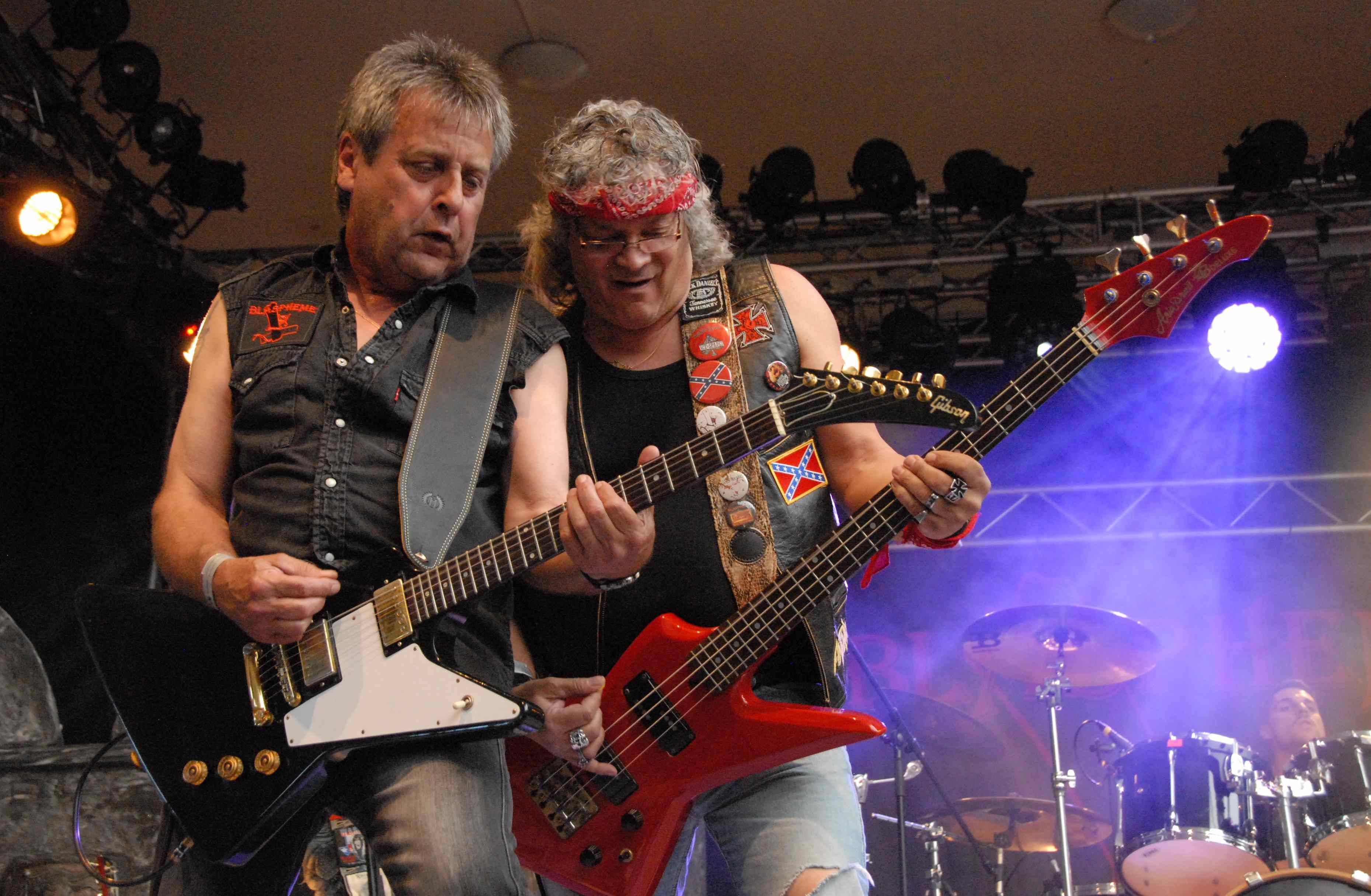 What should I write about RAVEN, that isn't said before? When I read that they would come over and play an old school set, it really made my day. The first three albums of this three headed killer bird are timeless and they contain only classic songs - no fillers, just killers - from the beginning until the very end. The fantastic gigs that they played in Holland are numerous and they never let their public down. I guess, we'll be in for a real treat from the guys of RAVEN, that are going to be here without 'The Baron', Joe Hasselvander. He has been replaced by Mike Heller, that you might know from his former band FEAR FACTORY or MALIGNANCY. Joe is suffering from health problems, but I think that in his heart he's here with his mates on stage. So in a slightly different line-up, the three musketeers of the 'athletic rock' jump on stage and start their energetic show with "Take Control". These first three albums contain so many good songs that it must be hard to choose from, but this is already a nice surprise, to start with. John and Mark always have a lot of fun on stage, which reflects back to the audience. After that, the "Hell Patrol" appears and John easily reaches the high screams in this one. Which other singer can do that and play bass at the same time? Not many, I guess. The 'three musketeers' feeling is getting stronger during "All For One". One of my personal faves from the album "All For One" is on next, namely "Hung, Drawn & Quartered". It's been a long time, since they played that one live. "Rock Until You Drop" is the title track of the debut album and a perfect chance to sing along, before Mark starts his guitar solo. Mark is the man, who always reminded me of an American football player. You'd better get out of his way, when he's invading the stage. No need to worry, as it's just an act. He's like a raging bull and he's definitely the master of pulling strange and funny faces. The man is still very fast and after his solo spot, the band gets to play some songs from the "Wiped Out" album with "Fire Power" and "Faster Than The Speed Of Light". The brothers only need a wink of an eye to understand each other and that's what makes RAVEN a winning team for a very long time now. Add to that, the catchy songs that you can still sing along to after thirty-something years and you’ll understand that I am having the time of my life here. "Hard Ride" is also from their debut album. Just take a look at the album cover, which shows the mess the band is leaving on stage. Their first single "Don't Need Your Money" is another chance to sing along for sure. At the end of this classic tune, it's time for John Gallagher and his undestroyable bass solo. The most elementary bass guitar he has got is waiting for the very last moment of the gig. It's the well-known red bass guitar that every fan will recognize, when he sees it. Four strings on a piece of wood with a knob to turn the sound up to louder or ultra-loud, what more do you need?? And if this bass guitar could talk... (lol). "Break The Chain" is on next and most of the time you can play a game of who recognizes the most snippets from classics that they play in the long stretched out version of this song. This time, there is no time for games, as the band is at full steam and they want to cut the crap, but there are still some 'hidden' classic rock songs, like for example "Iron Man" by BLACK SABBATH and the STEPPENWOLF song "Born To Be Wild". Udo Dirkschneider of ACCEPT joined them on the original single and this time Steve Grimmett joins the band for a duet. Afterwards, there is time for more classics, like "Rock Bottom" (U.F.O) and "It's A Long Way To The Top, If You Wanna Rock 'N' Roll" (AC/DC). All of these songs received the athletic RAVEN treatment. That leaves the band some time for one more song. In an underhand way, I hoped for "Tyrant Of The Airways", which is one of my favorites, but I was very glad to hear the fast "Crash, Bang, Wallop" instead. This has been another truly amazing RAVEN gig. All for one, RAVEN for all.