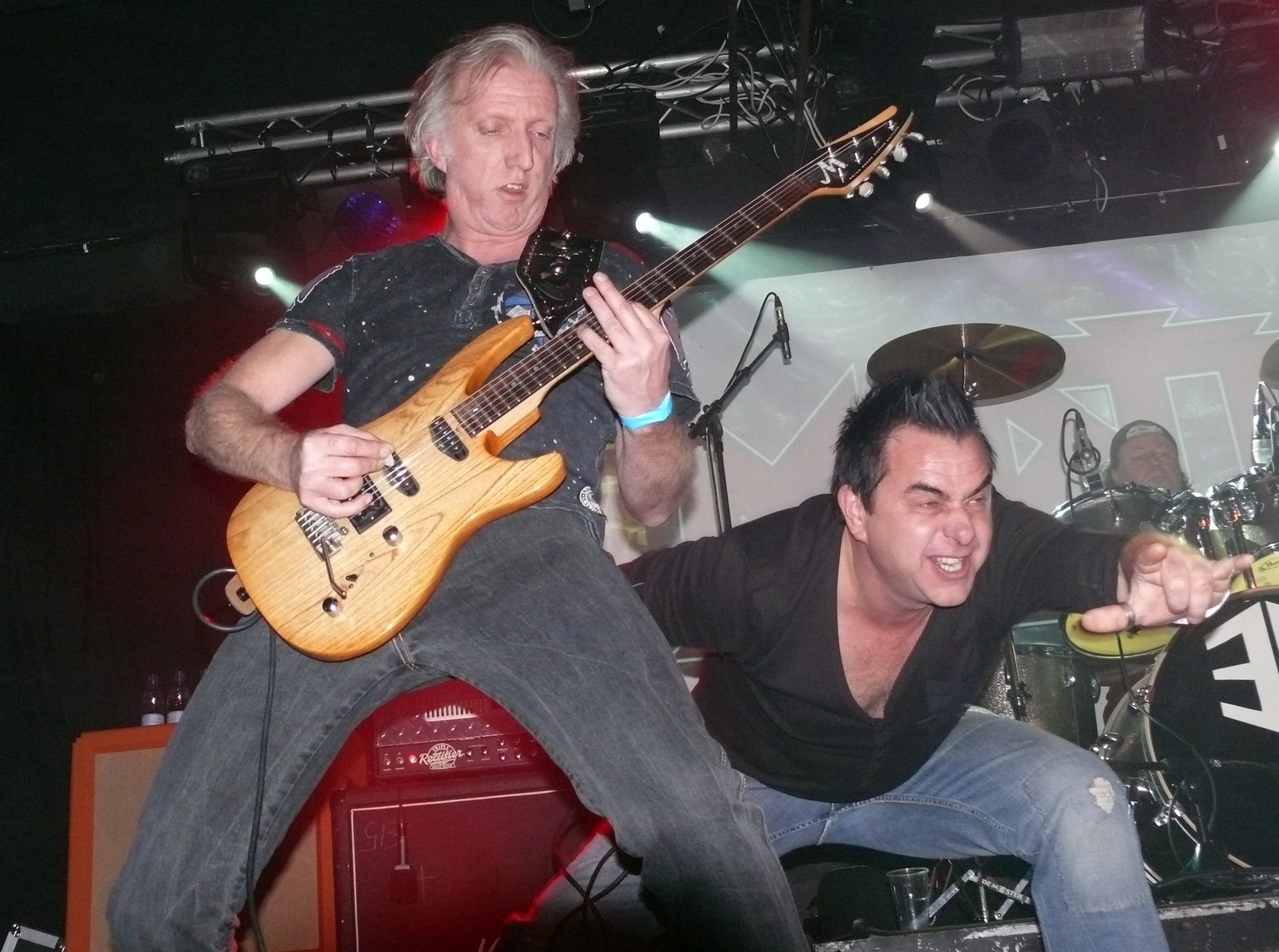 If my print-out schedule is right, MARTYR will be the next band of tonight. The intro tape sounds scary and horror-like, but nobody will be surprised if I tell you that a splendid party unfolds itself right after this very intro with “D.I.” and the wonderful “Afterlife”. The crowd goes insane and then it’s time for vocalist Rop van Haren to take a shower. He does this on stage, which is pretty convenient. Rop is the biggest eye-catcher of the band, but of course it’s the power of the two guitarists Rick and Marcel, that made this band so well-known worldwide. “Snow & Fire” is taken from the box of golden oldies. The old and new songs blend very well together and “The Uninvited” is from their recent album “Circle Of 8”. The newer songs have one thing in common. They have a super heavy groove and contain some nice blood soaked horror-like stories. When Rop sings them, you’d almost forget that they’re so bloody and creepy sometimes. By far the best new MARTYR song is the doom metal related “All Warriors Blood”. Its vibe, rhythm, groove and gradual tempo sounds really amazing! Bands like CANDLEMASS, TROUBLE, PENTAGRAM and ST. VITUS are famous for making songs like that, but MARTYR proves, that they are able to crank out such a doomy horror classic like that as well. What a roof lifter!! “Insensible Scream” is on next and after that, MARTYR takes us back to the earlier days of the band with “Black Sun” / “English Forces”. Not knowing that the Heavy Metal Maniac forces would be attacking the stage in no time during “Speed Of Samurai”. The limited space was not a problem for these musicians, who had the times of their lives with their air guitar playing friends on stage. Without being able to see each other anymore, they worked themselves through this classic song and the fanatic mess on stage was a fact very soon. However, Rop didn’t have enough and jumped off the stage to find a cozy place between the fans, where he found Bozzy of GLORIA VICTIS, who took over the singing parts at once. What an awesome show! How would it ever be possible to turn this into a normal situation again? Well, pretty easily the maniacs leave the stage after this song and the band gets back to their normal positions for “Scene Of Hell”. Right before “Circle Of 8”, Rop is ready for another shower and the show gets another adrenaline boost. The man is here, there and everywhere. And everywhere he goes, he carries that big smile on his face with him. In no time, we are “Eaten Alive” and I can only say, that I had a real blast with MARTYR again! When the “Outtro” bounches through the hall, we know that we are the lucky ones to have survived this violent ear attack. All that remains are headliners PICTURE and a huge smile on my face after this great show, that turned de Meester into one big party. This time, it’s the bass player that has been introduced to the audience. His name is Jeffrey Bryan Rijnsburger, who replaced Toine van der Linden, who was at the back of the hall and nodded that it was good. He is now the bass animal for REBELSTAR and came to see the show of his old band mates for old times sake. This is how things are sometimes. Band members come and go, but many times the old members stay on speaking terms with each other. Jacques van Oevelen also played with PICTURE in the past, and I’m almost certain, that these guys caught up with one another backstage as well.