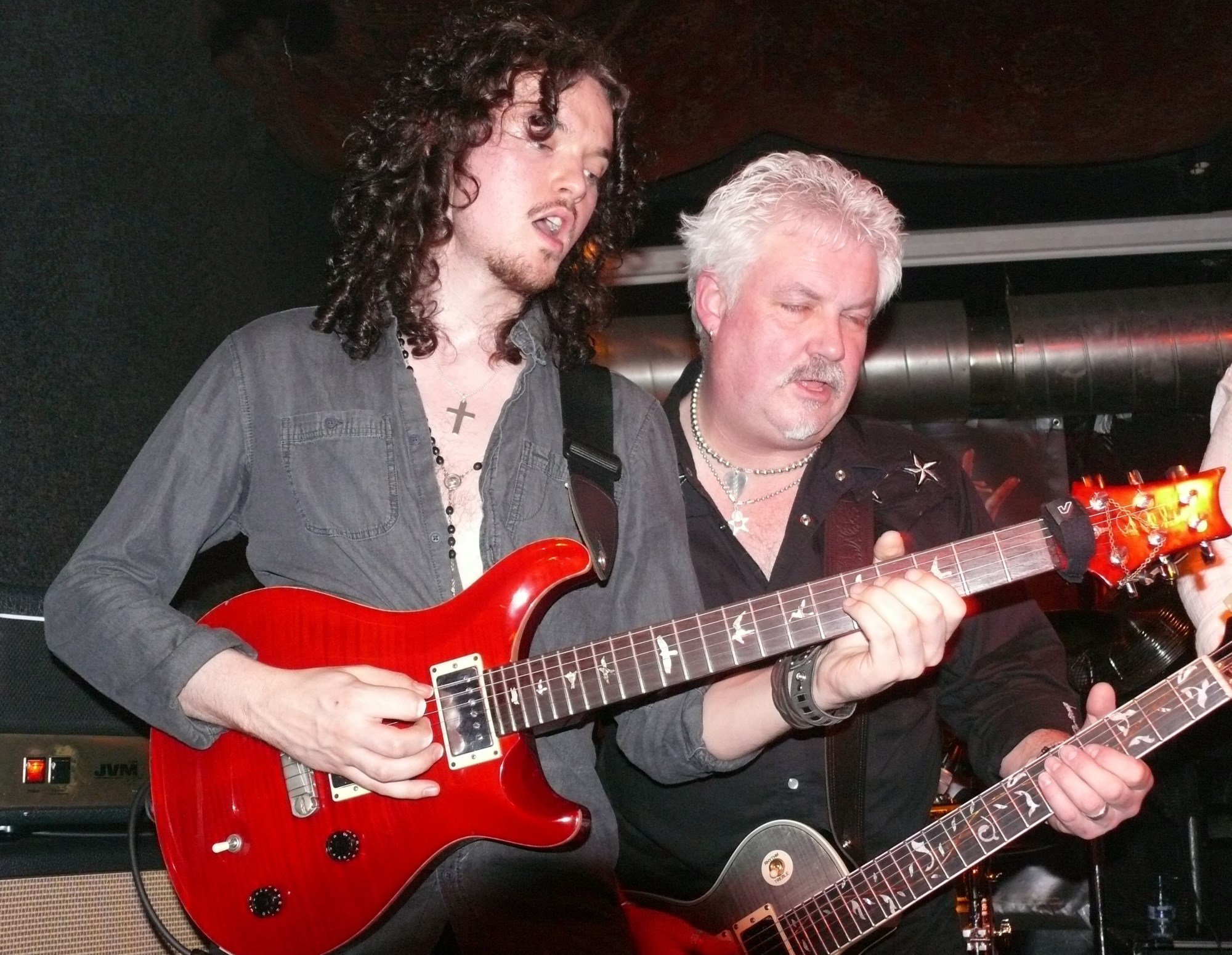 Never a dull moment with these guys from Bristol and I’ve never seen a bad show by these English veterans. Throughout the years, they’ve become close friends and it’s getting quite crowded in front of the stage, when the band is doing their soundcheck. Jamie shows MARTYR guitarist Rick his new tattoo and without hesitation, he pulls down his pants. Those things might happen, when you invite JAGUAR at your party. Everything is laid back and cool, until the first notes of “Out Of Luck” leave the amps. The Little Devil turns into a mess in a couple of seconds and soon you’ll know that this is the shit where the people have been waiting for. “New Tricks” is a newer (trick) song, but soon after that, we get back to that magic album “Master Game” with “Battlecry”, “The Fox” and “Master Game”. Jamie is unable to play with his jumping stick today, because otherwise he would have smashed his head against the ceiling. Now he’s concentrating on destroying the place with his heavy vocal sounds and funny jokes. “Warts & All” is also a new track and it has got the same feeling that the other songs have on me. It’s definitely the most powerful and energetic NWOBHM you can get and I simply can’t wait to lay my hands on this new silver disc. The new tracks, they cranked out tonight, predict a whole lot of good stuff. “Prisoner” and “Run For Your Life” continue tonight’s set and although the space is limited, Jamie knows to handle it very well. As long as Garry is having his own square foot it’s fine, but even that is a bit too much maybe on this small stage. Garry takes whatever he needs and is very focused on what he’s doing, as always. The solos are truly amazing and with “Ain’t No Fantasy” we are treated to another classic tune. The next new track is called “3 Minute Song” and once again it sounds unmistakable like another classic JAGUAR song in the making. “Raw Deal” receives a JAGUAR make over, including the GLORIA GAYNOR intro of “I Will Survive”, which hardly will be recognized the way JAGUAR plays it here. A short snippet of RAM JAM’s “Black Betty” is being introduced here as well. “War Machine” takes us back to the very early days of JAGUAR and from there on the mess is complete, because it’s time for the crowd’s highlights. The JAGUAR jukebox has started and the audience eats everything starting with “Backstreet Woman”, the first single they released in 1981. Then a very special track for the fans in Holland is on next, namely “Dutch Connection”. If the roof was lifted or not, I’m not too sure, but it was definitely during that song. Otherwise it must have been during “Axe Crazy”, a song which I heard shouting out loud many times, when the band announced a new song to play. Just to show my sympathy for this great band, for a moment I tried to move my legs, as a token of my appreciation. Limited space forced me to stand still and move my head up and down every now and then. I’m afraid, that was all the moving I could do during the whole show. In my head, the adrenaline was working overtime instead. When the crazy axe was buried, one more old friend came around the corner and that was the short and energetic “Stormchild” from the “Heavy Metal Heroes” sampler. And then this magical moment came, that I was being able to raise my fist in the air during the ‘shouting out’ to the lyrics of “Stormchild”. It felt like being in rock and roll heaven for a moment. The show was over in no time and finally we could have a short chat with the Jaguars. Not too long, because they had to make room for the other rock lions from England, the TYGERS OF PAN TANG. Obviously, we’re dealing with a whole (NWOBHM) zoo of all these wild cats here tonight (lol). Also, I could finally get rid of my chocolate letters, that I got from the Dutch Sinterklaas, which would be very useful on their way to Belgium tomorrow, I guess.