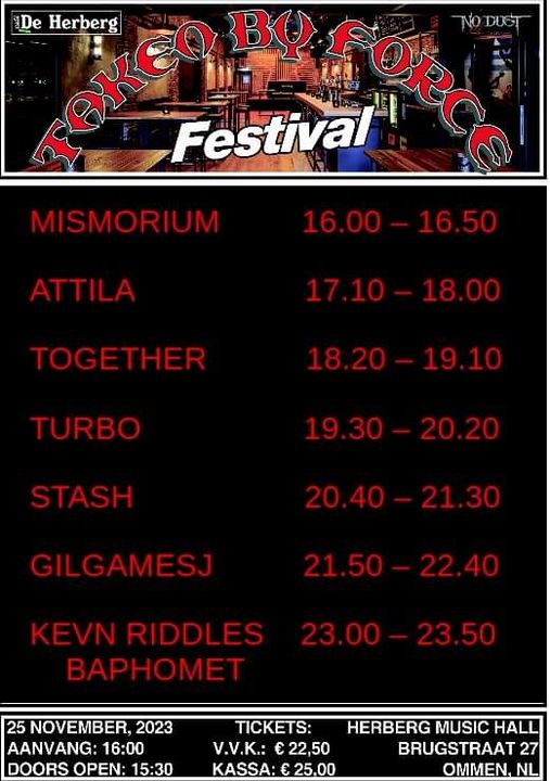 Wandelende metal encyclopedie Egbert Berenst zorgde weer voor een fraai programma op deze nieuwe editie van zijn Taken By Force festival. Liefhebbers van old school Nederlandse metal kwamen voornamelijk aan hun trekken. Niet alledaagse namen passeerden de revue en als klap op de vuurpijl kwamen er nostalgische gedachten bovendrijven tijdens uitsmijter Kevin Riddles' Baphomet. Plaats van handelen is De Herberg in Ommen, de perfecte locatie voor dit gezellige 'ons kent ons' metal gebeuren.