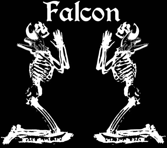 Perry: “Ha! I’ll take the credit for that one. I’m such an enormous CIRITH UNGOL fan, and have always dug the kneeling skeletons and bizarre font of the CIRITH UNGOL logo. Even though it’s very simplistic and Greg got the skeletons out of a clip art book, I still love them to death. I think Greg would actually like to tape my mouth shut on this particular answer. Hahahaha! He gets a little tired of the skeletons sometimes. After all, FALCON is its own band and has its own identity, although we do owe much to CIRITH UNGOL. Even though Greg would rather distance us from the praying skeletons, I had to at least throw that graphic up on the website, complete with the falcons perched on their shoulders!”
