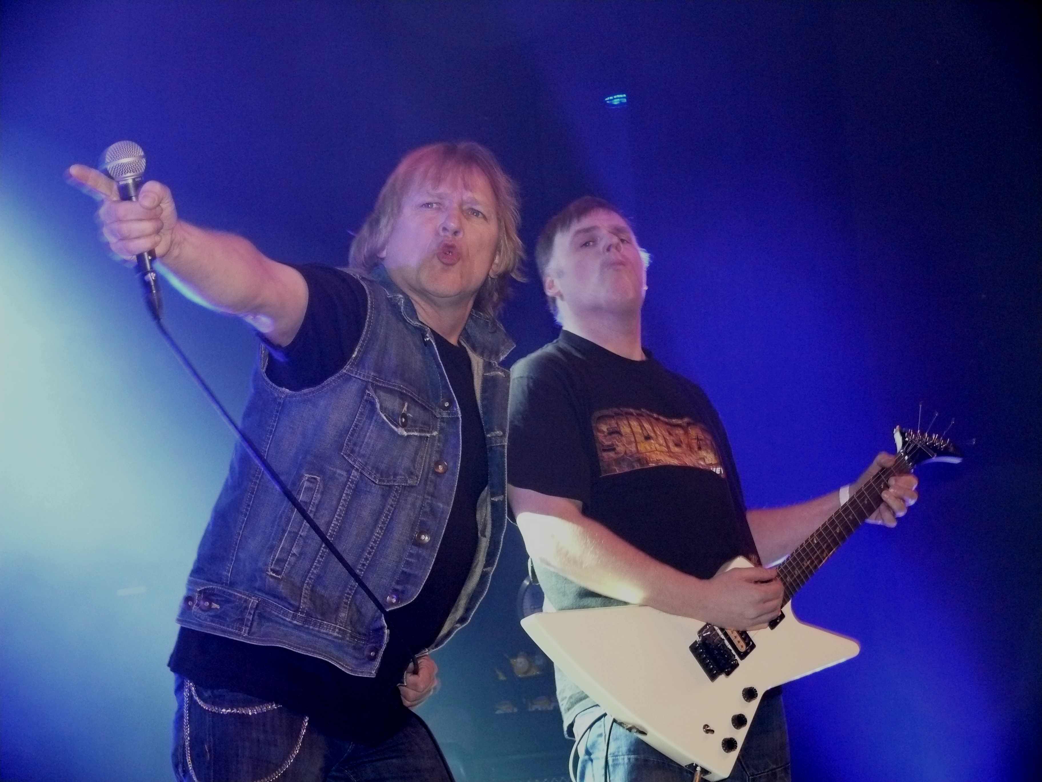 Als eerste band komt FINAL HEIRESS in actie. Jan Palenstijn is het boegbeeld van deze band, die het echt een genot vindt om op het podium te staan. Dat ene singletje doet het hem en daar kennen we FINAL HEIRESS van. Een enkel exemplaar is nog te koop vandaag. Maar als echte fan heb je dat ding al heel lang in je collectie. “Look Around” betekent de aftrap en de band is in goede doen. Flitsend gitaarwerk van de langharige van Rijswijk doet me watertanden en Jan zet zijn beste beentje voor. Hij is dankbaar om hier te kunnen zijn. Fans weten waarom en hij kwijt zich meer dan vakkundig van zijn taak om de zaal eens lekker op te warmen. Een ondankbare taak wordt vaak gezegd, maar Jan ziet het als een eer om het publiek wakker te schudden. Het doet me dan ook wel iets om mijn naam te horen in zijn dankwoord aan het begin van het optreden. Een teken van erkenning. “Cry From The Undertow” laat ons horen wat FINAL HEIRESS in zijn mars heeft. Scheurende gitaren, maar ook een gevoel voor melodie klinken door in de nummers. De single mag natuurlijk niet ontbreken in de set. Voor- en achterkant komen voorbij zetten, eerst “Twisted By Rules”, daarna het melancholieke “You’re In My Heart”. In dit laatste nummer zit zelfs even een moment van bezinning. Vuurwerksterretjes en aanstekers worden uitgedeeld en we staan even stil bij hen, die er niet meer zijn. Een prachtig moment vind ik zelf en aan het verzoek om de sterretjes op te branden en te denken aan een dierbare wordt dan ook gretig gehoor gegeven, wat soms zelfs hier en daar leidt tot emotionele taferelen. Dat weet muziek bij mensen los te maken. Het is een emotie, die soms heel diep kan gaan. Het zijn niet alleen scheurende gitaren en beukende drums en wild krijsende zangers. Wel voor 99 procent natuurlijk, want metal is nou niet bepaald voor watjes, maar in die metal heads zit ook vaak een hart van goud wat je aan de buitenkant meestal niet ziet. In een nummer werd dat even bloot gelegd om daarna weer snel te verbergen onder een ijzeren harnas of een spijkerhesje met emblemen van je favoriete bands. Mooi toch zo’n moment, maar aan het einde van de set is de zoete koek op en moet er nog een keer echt gebeukt worden. Klaarkomer van de set is dan ook afsluiter “The Omen”, wat ik zelf nog steeds het beste FINAL HEIRESS nummer vind. De kop is eraf en dit soort taferelen had ik inderdaad voor ogen. Een band, die er twee honderd procent voor gaat inclusief een schoonheidsfoutje hier en daar misschien, maar met het hart op de juiste plaats. Na het optreden komen we nog even met Jan in contact en laat hij vol trots zijn plakboek zien met foto’s en herinneringen uit vervlogen tijden. Foto’s van zijn tijd met FINAL HEIRESS en SAD IRON (waar hij ook als zanger fungeerde) zitten nu onder het kwijl van ondergetekende. Ik kon er echt niets aan doen Jan, maar wat een prachtige herinneringen kwamen er boven bij het doorbladeren van dit materiaal. Nog even de promo disc aanschaffen en dan is het alweer tijd voor de tweede band.