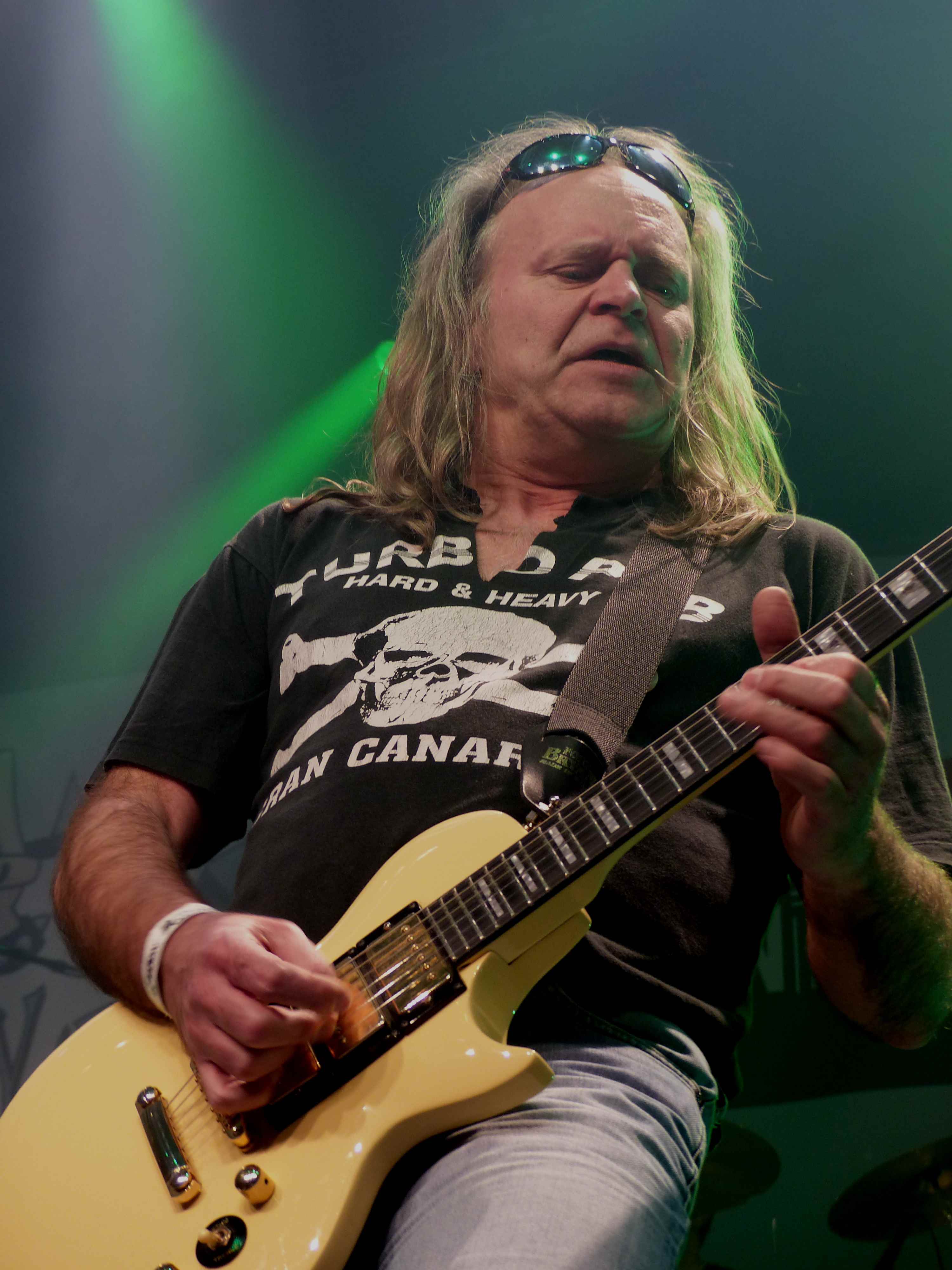 We verkassen terug naar de linkerkant van het podium. Na TOGETHER zijn we naar rechts verhuisd, omdat er bij ELISE, SWORD / JEWEL en FRANKENSTEIN aan de rechterkant een paar kopstukken zich opstelden, die we goed op de foto wilden hebben. Bij PICTURE gaan we op links Rinus aanmoedigen die zich weer volledig heeft hersteld nadat hij onlangs wat problemen had met zijn gezondheid. Bij het jubileumoptreden van JACKAL misten we hem nog, maar ‘ijzeren Rinus’ was er weer bij en PICTURE treedt dus in vol ornaat aan vanavond. Nog een keer mag Angel haar taak vervullen om een van haar favoriete bandjes aan te kondigen en dan gaan we de laatste ronde in. PICTURE neemt er de tijd voor. Officieel staat er voor hen ook vijfentwintig minuten op de teller, maar ze zijn toch echt een soort headliner en mogen daarom ook bijna het dubbele van de zendtijd op het podium staan. “Griffons Guard The Gold” is de opener van deze uitsmijter. De gitaristen gooien met solo’s of het niets is en Pete Lovell blijft een geweldige zanger, die constant weet te overtuigen. “Message From Hell” blijft een van mijn favorieten, maar mijn hoofd wil haast niet meer op en neer. Als ik nog langer op en neer ga, komt er olie uit de grond in Zwolle en dat kan nooit de bedoeling zijn. “Eternal Dark” is wereldwijd een klassieker geworden. Misschien mede door toedoen van HAMMERFALL, maar wat die Vikingen ook willen en doen, het blijft natuurlijk een PICTURE nummer.