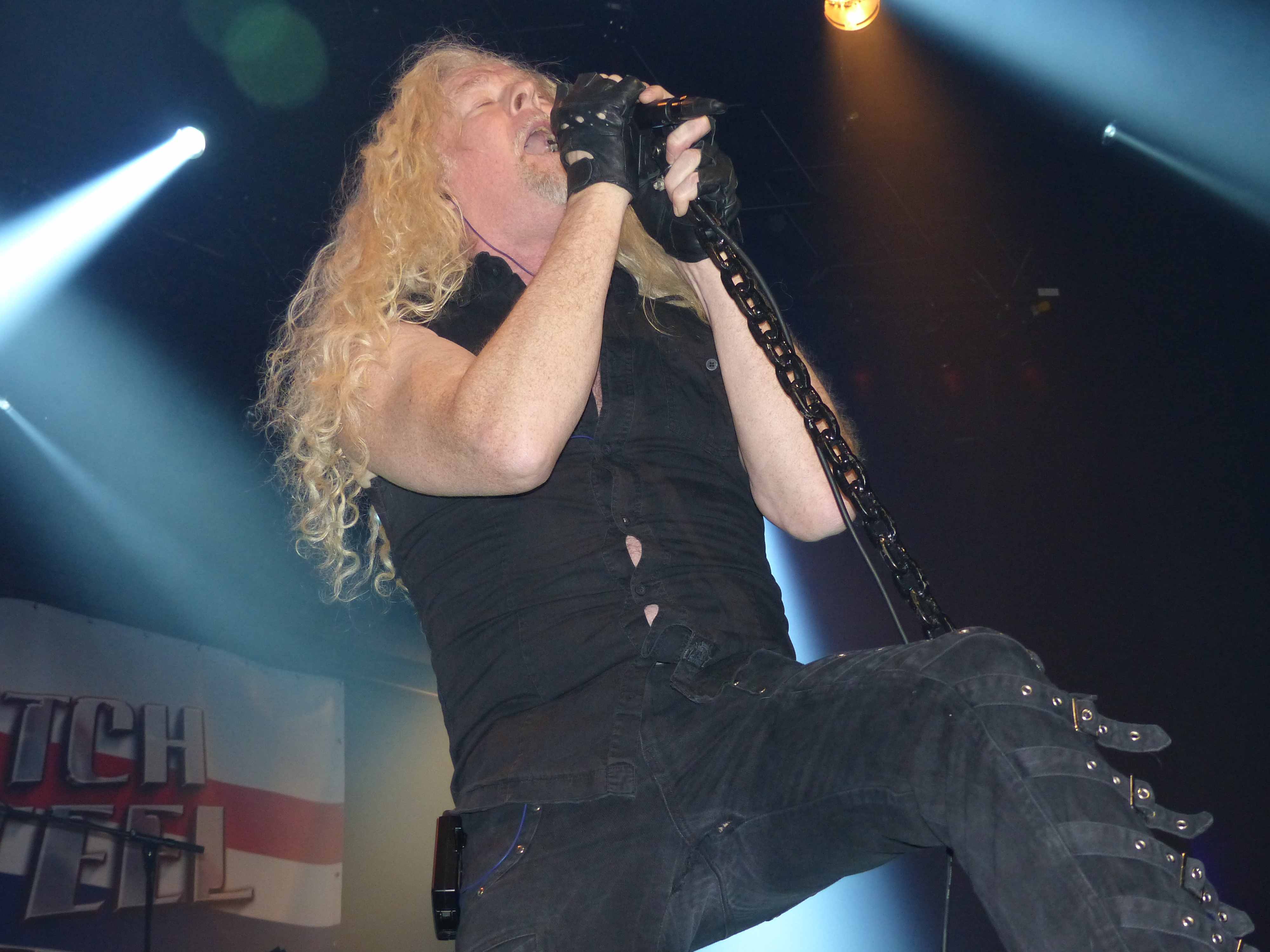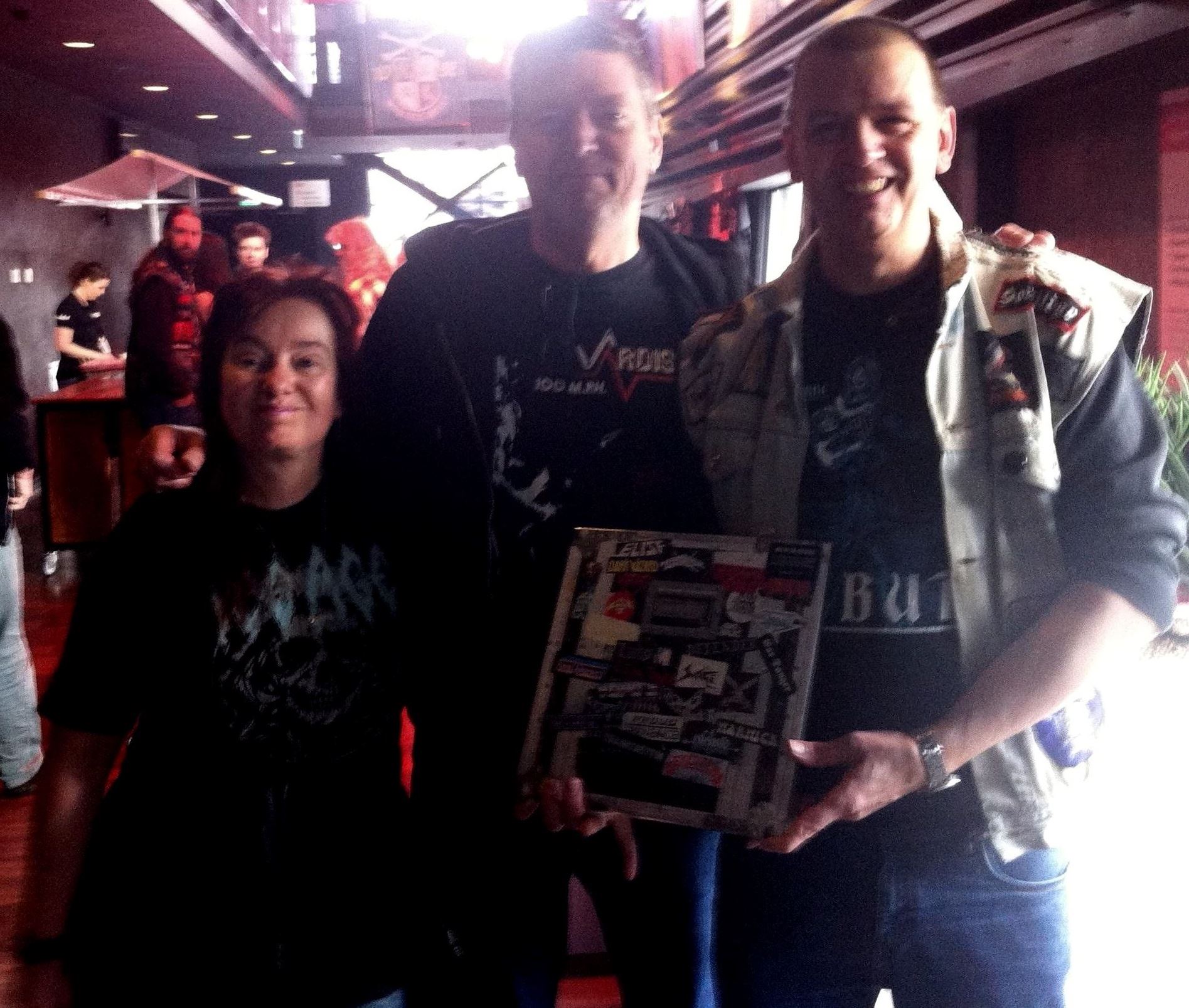 Iets waar ik erg naar uit heb gekeken is het optreden van MARTYR. Natuurlijk een niet te missen speler hier vandaag, maar in hun optreden zal een gastoptreden zitten van Jack Nobelen en dat is echt iets uit mijn thuishaven Breda en omgeving. Maar eerst mag gezelligheidsbeest Rop van Haren de zaal op stelten komen zetten. Wat een klasbak is MARTYR. Vaak hoopte ik, dat ze wat meer oude nummers in hun set wilde stoppen. Maar de tijd gaat natuurlijk door en je kan niet altijd stil blijven staan bij het verleden, al pleeg ik dat zelf wel vaak te doen. Dat nieuwe werk gaat er gelukkig ook in als zoete koek, maar het idee dat vandaag bij hun ook in het teken zal staan van lang vervlogen tijden, maakt mij alweer een blij man. “Darkness At Times Edge” is daarbij natuurlijk een goed begin. De gitaartandem bestaande uit Marcel Heesakkers en Rick Bouwman draait op volle toeren en zo hoor ik het graag. Ik blijf ontzag hebben voor Rop. Die legt wat kilometers af op het podium en daarnaast herkent hij ook iedereen in de zaal tijdens het optreden, heeft hij tijd om gekke smoelen te trekken en zingt hij ook nog eens loepzuiver of althans zo goed als. Wie zei er ook alweer, dat mannen niet kunnen multi-tasken? “Snow And Fire” is eigenlijk een must vandaag, want met dit nummer staat de band op “Dutch Steel”, de verzamel LP uit 1984. Als dat geen extra reden is om dit ouwetje uit de kast te trekken, dan weet ik het niet meer. Rop neemt nog even een spa blauw douche en na dit korte badmoment is het tijd voor datgene, waar ik naar uit had gekeken. Jack Nobelen, producer natuurlijk van de laatste MARTYR releases, mag opdraven om de SAVAGE klassieker “Starbreaker” mee te spelen met MARTYR. Imposant en dan laat ik de rest van de superlatieven maar even achterwege, want die zijn niet geschikt voor jeugdige luisteraars. Zelfs de poses, die de kleine, grote man aanneemt doen me herinneren aan de hoogtijdagen van MICHAEL SCHENKER. Natuurlijk is het geweldig om Jack met zijn band STILETTO bezig te zien op een pleintje in Antwerpen, waar we toevallig waren, maar dat kan voor mij toch niet in de schaduw staan bij de vijf minuten, die hier aan me voorbij trekken. Volgende keer “Hell On Wheels” of zelfs “Heavy Rock And Roll” jongens, dan kan je de glimlach helemaal nooit meer van mijn gezicht af krijgen. Weer een kippenvelmomentje erbij en de koek is nog lang niet op. We missen nog het lijflied van MARTYR. Nou, dat komt eraan, want “Speed Of Samurai” mag natuurlijk niet overgeslagen worden vandaag. De puinhoop is compleet, want er volgt een ware invasie van het podium. Nima van GLORIA VICTIS neemt mede de zang voor zijn rekening als extra special guest star. GLORIA VICTIS heeft dit nummer ook in hun set, dus de voorbereidingen zijn goed. Maar wat Nima kan, dat kunnen de Heavy Metal Maniacs ook en voordat je het weet staat het hele koor mee te blèren en te bangen op dit nummer. Erik van der Pol ontpopt zich als mede zanger en na dit gezellige samenzijn, waarbij Jack ook nog even inplugt, staat het podium stampvol. Na de eerste solo wordt Jack ook nog op de schouders van Rob gehesen en naar ongekende hoogte gebracht. Iets waar ik al vertoef voor een tijdje, want dit weerzien is toch wel erg gaaf. Na dit spektakel der Japanse zwaarden, volgt er weer een wat langere pauze. Eigenlijk zou VORTEX nu aan moeten treden maar op dit uur van de dag (het is nu iets na zeven uur ’s avonds) lust een mens wel een hapje en we hebben door het wegvallen van VORTEX wel even de tijd. Voor mij dan ook reden om even met de leden van VORTEX, die er wel zijn, een praatje te maken. Orion Roos, Henk Bosma en Rene van Zonneveld geven aan, dat Martjo Brongers op zich wel had willen komen, maar dat dit toch misschien allemaal iets te druk zou zijn voor hem. Echt heel erg jammer. We hebben je gemist, Martjo en Jurjen en het feestje was maar voor 99% compleet zonder jullie. Wel was het leuk om wat verhalen te horen van Orion en Rene over MAESTRO. Voordat ik de zaal weer in ga krijg ik nog kort de tijd om Robert ‘Dutch Steel maestro’ Haagsma te spreken. Hij was heel erg tevreden over wat hij tot nu toe gezien had en genoot zienderogen van de grote hoeveelheid mensen, die op dit evenement afgekomen waren.