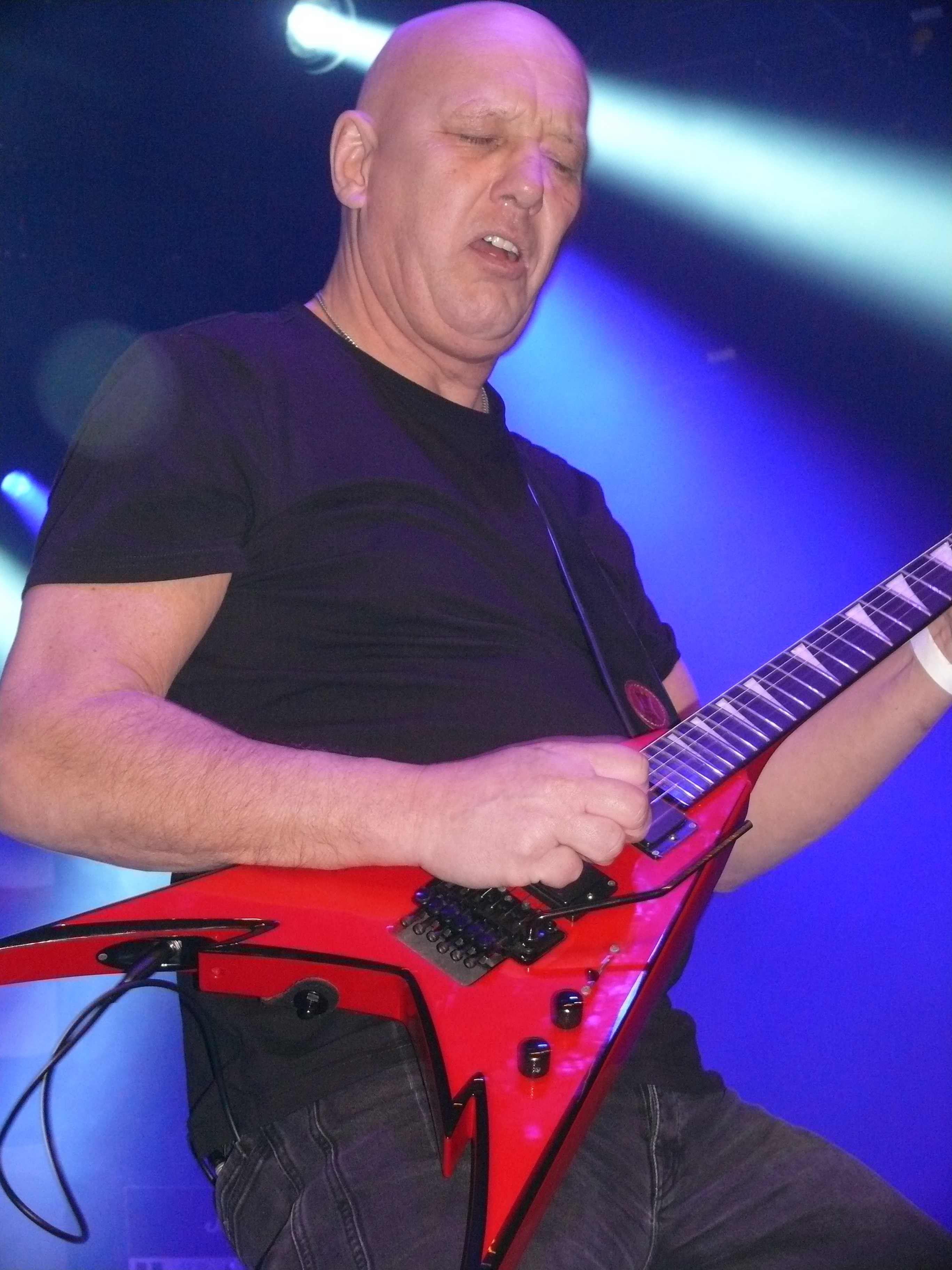 GILGAMESJ staat al bijna veertig jaar garant voor een bak spetterende hard rock. Zoals al eerder aangegeven, kom ik soms wel eens een van de leden tegen hier in Leerdam rock city en de zanger is zelfs nog een paar jaar onze onderbuurman geweest. Jongens van de gestampte pot, die ook nog eens muzikant zijn in hart en nieren. Maar vandaag zijn ze muzikant en ze hebben de hardste nummers uit hun uitgebreide song collectie gekozen om te spelen. Ze mogen dan misschien niet zo heel veel wapenfeiten op de markt hebben gebracht, maar de fans van de band weten dat er nog heel veel onontdekte pareltjes op demo’s en verzamelaars rondzwerven. Leden van het eerste uur zijn hier gitarist Gerrie den Hartog, die het midden houdt tussen Michael Schenker en Ronnie Montrose en zanger Frank van Stijn, die echt een van de meest ondergewaardeerde zangers van Nederland is in mijn ogen. Mensen, die dit grootspraak vinden, wil ik graag verwijzen naar de oorarts. Achterin, verscholen achter zijn drumkit, zit maestro Jacques van Oevelen die onder andere ook in PICTURE en SAD IRON heeft gedrumd. Maar het ging over de muziek hier vanmiddag, geloof ik ,he?! Na een gitaarintro komt “Revolution”, een tandje langzamer dan het origineel, maar het blijft echt een geweldig nummer wat ingenieus in elkaar zit. Afkomstig van de twelve inch “Take One”, waarvan vandaag drie van de vier nummers gespeeld zullen worden. Het enige nummer wat hier niet van af komt is “Ticket To Heaven”, want dat staat op “Metal Clogs”. Dat waren nog eens tijden, toch?! In “Daybreak” laat Frank nog eens horen wat hij in huis heeft. Eerst twee nummers de zaal overrompelen met flitsende gitaarsolo’s en snelle nummers en dan even iedereen terug naar de werkelijkheid sturen. Op het nieuwe album zal dit nummer waarschijnlijk in een herbewerkte versie het daglicht weer gaan zien als “Another Daybreak”. Deze versie bezorgt me even kippenvel in ieder geval. “Oppression” is de afsluiter alweer en dit is weer zo’n juweeltje uit de GILGAMESJ koker. Voor mij ging dit optreden voorbij als een alles overrompelende wervelwind. Een vernietigende storm, die de zaak even wakker schudde en voorbij was, voordat je er erg in had. Gelukkig kon ik de band een weekje later nog een keer aanschouwen in hun thuisbasis Leerdam op het Reza Fest. Daar werd in ieder geval nog even gezellig nagepraat over deze dag. De verhalen van Jacques zijn in ieder geval meesterlijk, net als zijn drumwerk.