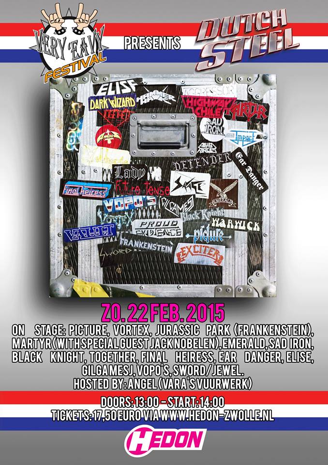 Toch gaan de gates open rond de klok van enen, als er in Zwolle nog weinig actie is te beleven. In de Hedon staan er al mensen zenuwachtig voor de deuren van de poptempel te wachten, totdat ze naar binnen mogen. Eenmaal binnen worden we opgewacht door Robert Haagsma, die ons al voorziet van nummer 000006 van de tripel kleuren vinyl box van “Dutch Steel”. De hoofdprijs is al binnen. Even poseren voor een foto met de maestro zelf en dan even Hugo Koch gedag zeggen. Hij heeft het weer voor elkaar, hoor. Zes weken later zullen we in Stadskanaal aantreden voor Very ‘Eavy, waar hij voor de liefhebbers van het Nederlandsche geweld heeft gezorgd voor bands als ELISE, EAR DANGER, en SAD IRON. Een soort van “Dutch Steel” light zeg maar, maar dan aangevuld met klinkende namen als TYSONDOG, TOKYO BLADE, RAVEN en SATAN, om er maar een paar te noemen. Als deze namen je niets zeggen, weet ik niet of het echt verstandig is om wel verder te lezen. Het is de creme de la creme van de begin jaren tachtig NWOBHM scene. Maar we dwalen af en het gaat om de Nederlandse bandjes hier. Al snel komt een tweede domper op de feestvreugde om de hoek kijken. EMERALD zal ook niet optreden vandaag, want zanger Bert Kivits is niet in staat om te zingen. Jammer en van gitarist Paul hoor ik inderdaad dat de keuze om vandaag niet te spelen een weloverwogen keuze is geweest. Lang is er getwijfeld, maar het is gewoon het beste om deze ex-STASH frontman niet het podium op te laten gaan, hoe erg dat ook is. Dus we zullen het zonder VORTEX en EMERALD moeten doen. Bert komt nog wel even kijken, maar is duidelijk beroerd. Gitarist Paul van Rijswijk is er ook, want die mag bij opener FINAL HEIRESS aantreden. Een blik in de zaal wijst erop, dat Hugo niets te veel heeft gezegd over de prachtige banner die achter het drumstel hangt. De mensen weten nu wel waar het om gaat. De presentatie van vanavond is in handen van niemand minder dan Angel, de side kick van Henk Westbroek van Vara’s Vuurwerk, zeg ik maar even oneerbiedig. Want wie Angel kent, weet dat zij ook al heel wat jaren meeloopt in dit wereldje. En zaten we ons dertig jaar geleden niet allemaal te verlekkeren op het warme hese stemgeluid van Angel, waarbij we uiteraard fantaseerde hoe zij er nou eigenlijk precies uit zou zien? Voor wie onder een steen heeft geleefd was vandaag dus de dag, dat je Angel weer een keer in levende lijve kon aanschouwen. Een geweldige keuze, want daar alleen kom je de deur voor uit, als je net als ik voor de radio gekluisterd zat als er weer eens een metal programma te horen was. Alfred Lagarde is jammer genoeg alweer een tijdje geleden overleden en Hanneke Kappen zingt nu liever haar jazzy versie van “Nothing Going On In The City”. Of Henk Westbroek zelf het heilige vuur nog in zich heeft is niet duidelijk, maar ik denk dat hij liever Utrechtse politiek bedrijft, dan dat hij in Zwolle bandjes aankondigt. Ik denk, dat niemand er rouwig om is dat Angel vanmiddag en vanavond deze taak op zich neemt.