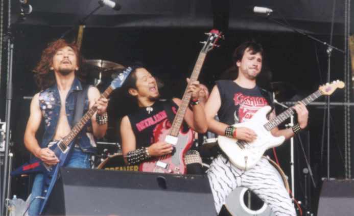 After this I had to rush to another stage, where a Japanese metal orgasm started. METALUCIFER….. Either you worship them, or you think that they’re absolutely over the top. I loved every single second that Gezol (who also plays in the Japanese black metal band SABBAT) was on stage with his band. The NWOBHM like sound of this band is a mix of the best of ACCEPT, JUDAS PRIEST, IRON MAIDEN, SAXON and ANGELWITCH. The band was completed by members of the German heavy metal band METAL INQUISITOR on guitar and drums. During “Heavy Metal Chainsaw”, a guy showed up with a chainsaw to complete this Japanese metal party. At the end, the guitar player smashed his beautiful purple Flying V guitar, and threw the remaining parts into the public. An awesome gig, and definitily one of the highlights of the whole festival for me. I hope that these guys come back real soon. I really had to go backstage for a short moment to congratulate these guys with their great show.