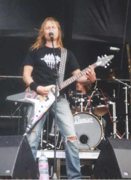I already heard the first notes of ROTTWEILLER, a great US Metal band, who were really playing a hell of a show. They played a secret gig in Itzehoe already on Wednesday, as support act for WARLORD. And they also kicked some serious ass there, for a small crowd. For a good metal band, you had to get up very early. ROTTWEILLER was playing for a handfull of diehard fans, at ten in the morning. I wonder why a band from the USA, makes a long trip to Europe to play at a two days festival at ten o’clock in the morning, while everyone is still asleep? Some of the drunken visitors had just found their tent at that time of day. People, who missed this show, just don’t realise what they’ve missed, I guess. ROTTWEILLER already completed their ‘new’ CD “Screams Of The Innocent” in 1985. The diehard US Metal fans will know enough now, I guess. We are dealing with a cult name in the scene, that easily could be compared with names like HALLOWEEN (USA), CULPRIT or S.A. SLAYER. These names got in my head, when I saw this band play. ROTTWEILLER opened their set with a guitar solo. Honnestly, which other band would do this today?? No rules, just do what you like. That was definately the attitude of this band. We heard perfect versions of great metal anthems like “Seduction From Hell”, “No Escape”, “Where Am I” and “Intense As Hell”, completed with long, fabulous guitarwork. Mindblowing!